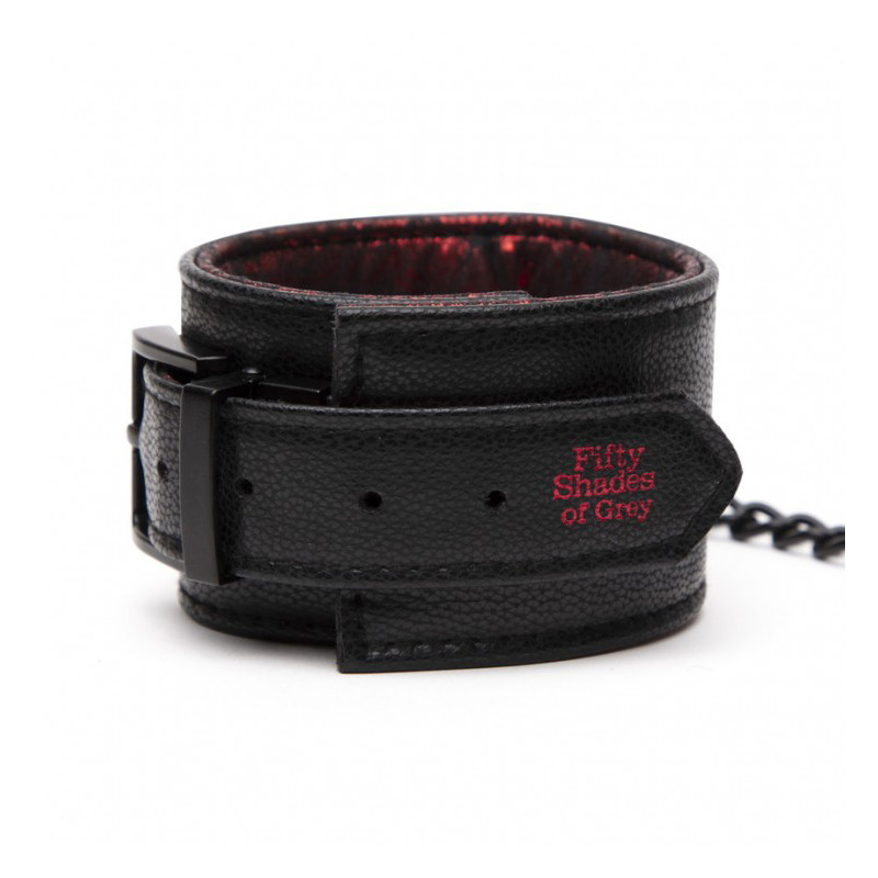 Este modelo de esposas de 50 Sombras de Grey está diseñado para el uso en las muñecas. Las esposas reversibles están unidas entre sí por una pequeña cadena de metal y apenas ofrecen libertad de movimiento. Producto ofrecido por diversual.com.