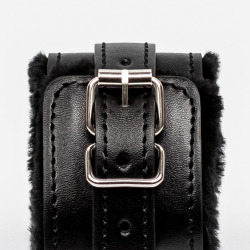 Esposas de cuero vegano negro muy flexible. Este accesorio de BDSM tiene en su interior un acabado de pelo sintético suave que evita cualquier roce o molestia mientras se usan.