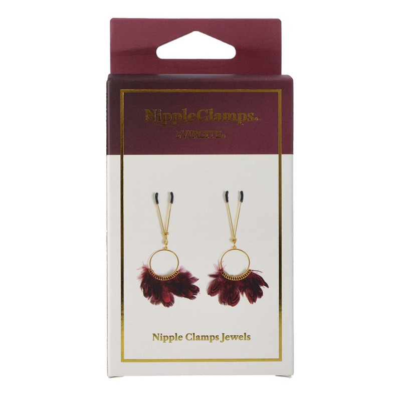 El diseño colgante de estas pinzas para los pezones incluye varios detalles muy atractivos desde el punto de vista visual. Uno de ellos son las dos grandes anillas de metal dorado y el otro las plumas rojas que cuelgan de estas.